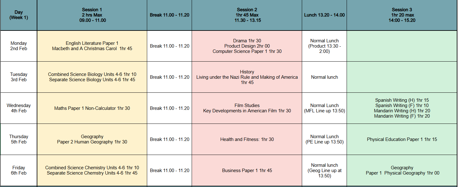 Many subjects also include non-exam assessments (NEAs) or practical exams — such as Drama, Dance, language speaking tests, Photography and Food Preparation and Nutrition — which take place throughout the academic year.