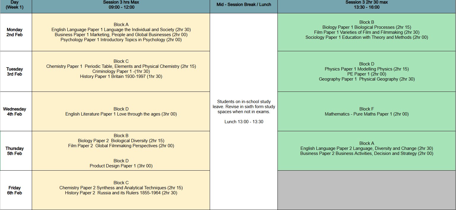 Summer 2026 written examinations for GCSE and GCE (A Level and AS Level) will take place between 7th May 2026 and 23rd June 2026. All students must be available for the entire examination period.