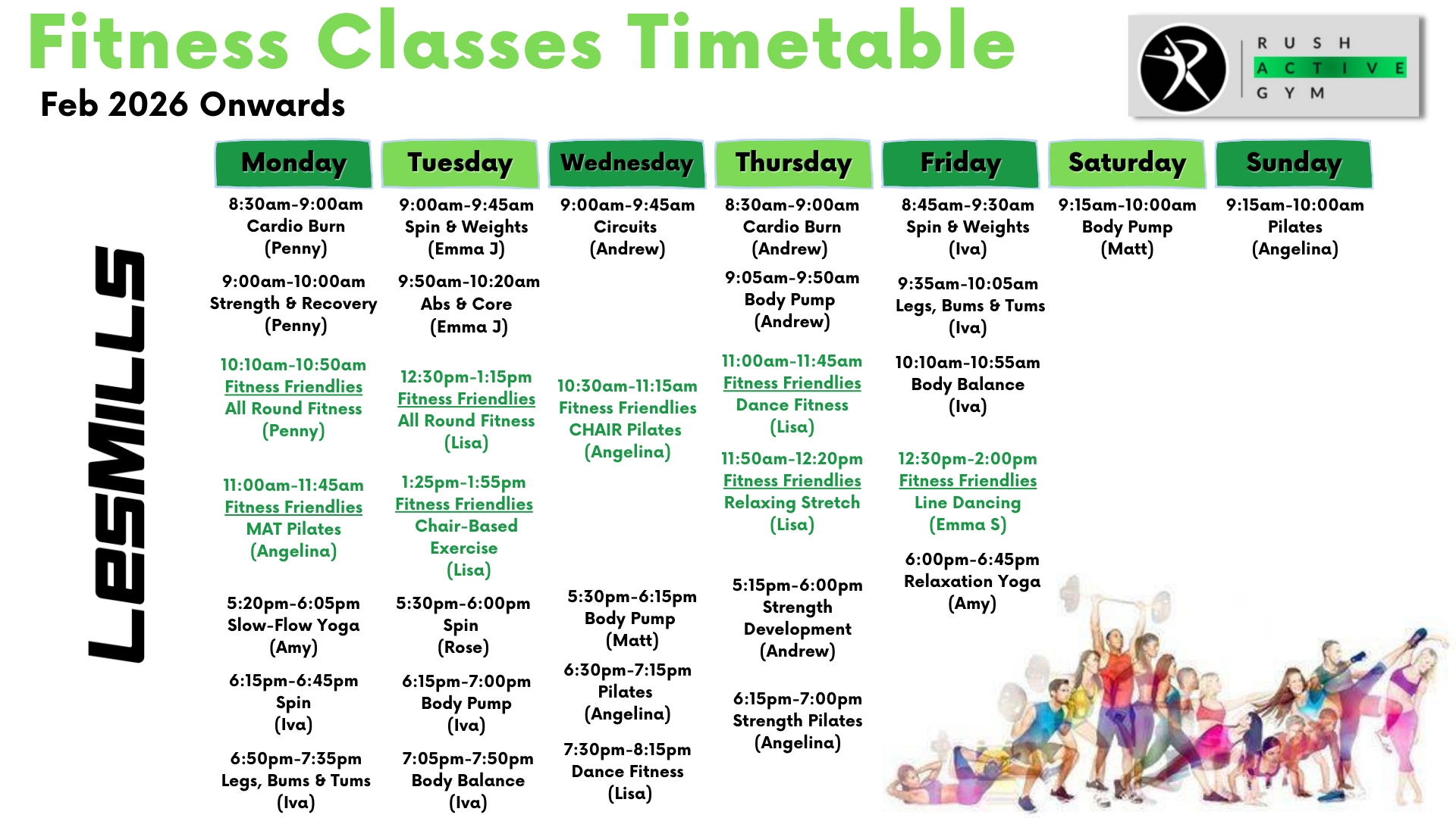 Higher impact Les Mills and Rush Active Classes run in the mornings, evenings and at the weekends, ranging from half-hour to hour long classes.